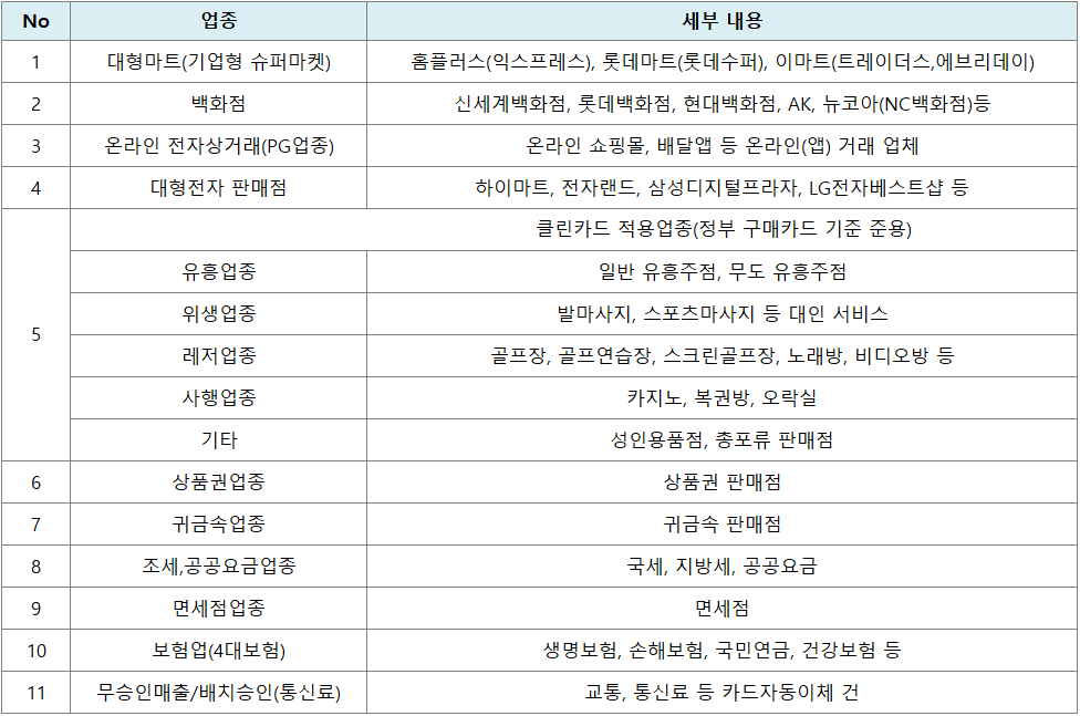 재난지원금의 목적에 맞게 사용처가 정해져 있습니다. 제외 되는 곳을 확인해서 개인결제도 진행되지 않으니 미리 확인해 두는 것이 좋겠습니다.
